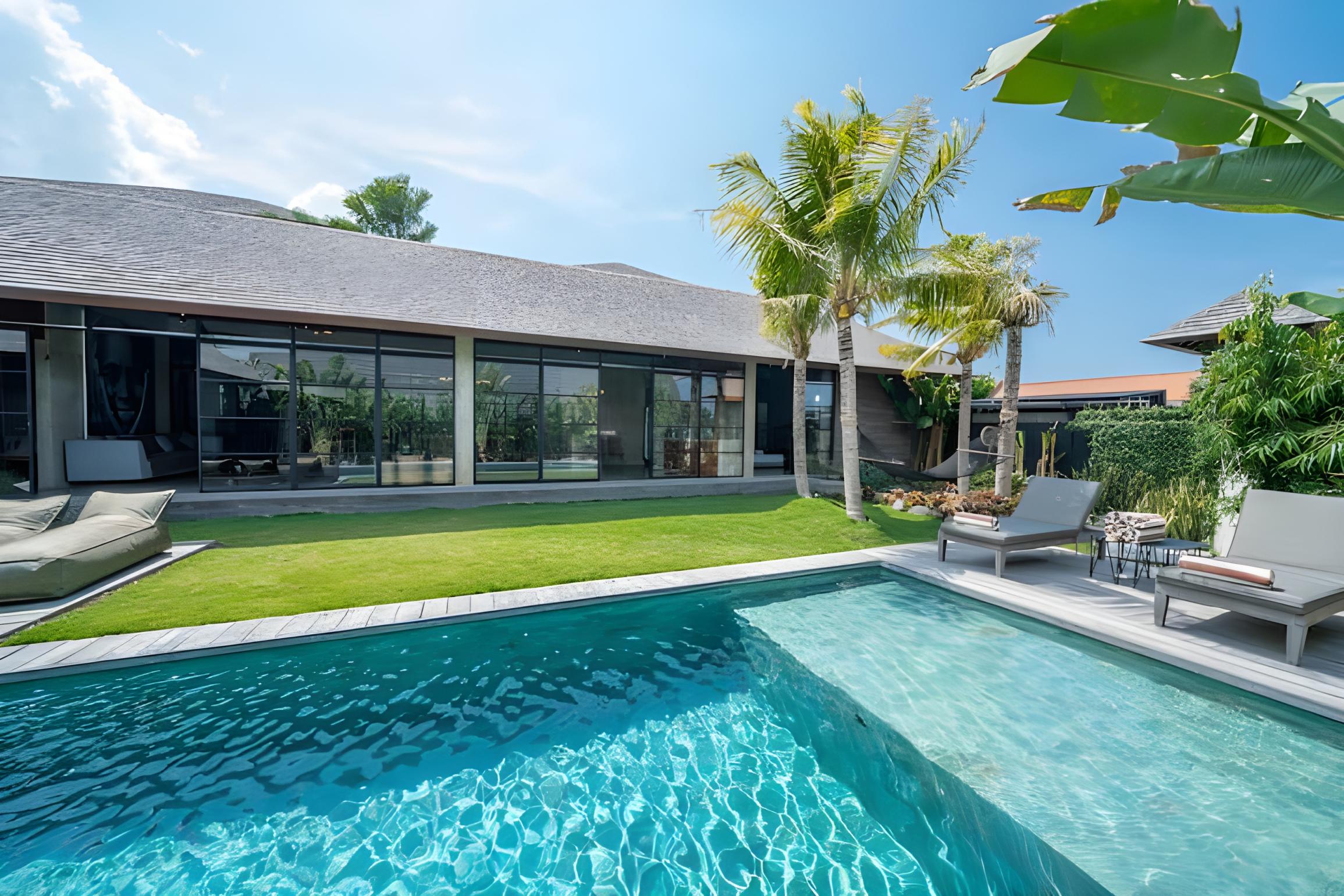 Tropical garden with a large 12 x 4 m² pool, sun loungers, and a lounge area