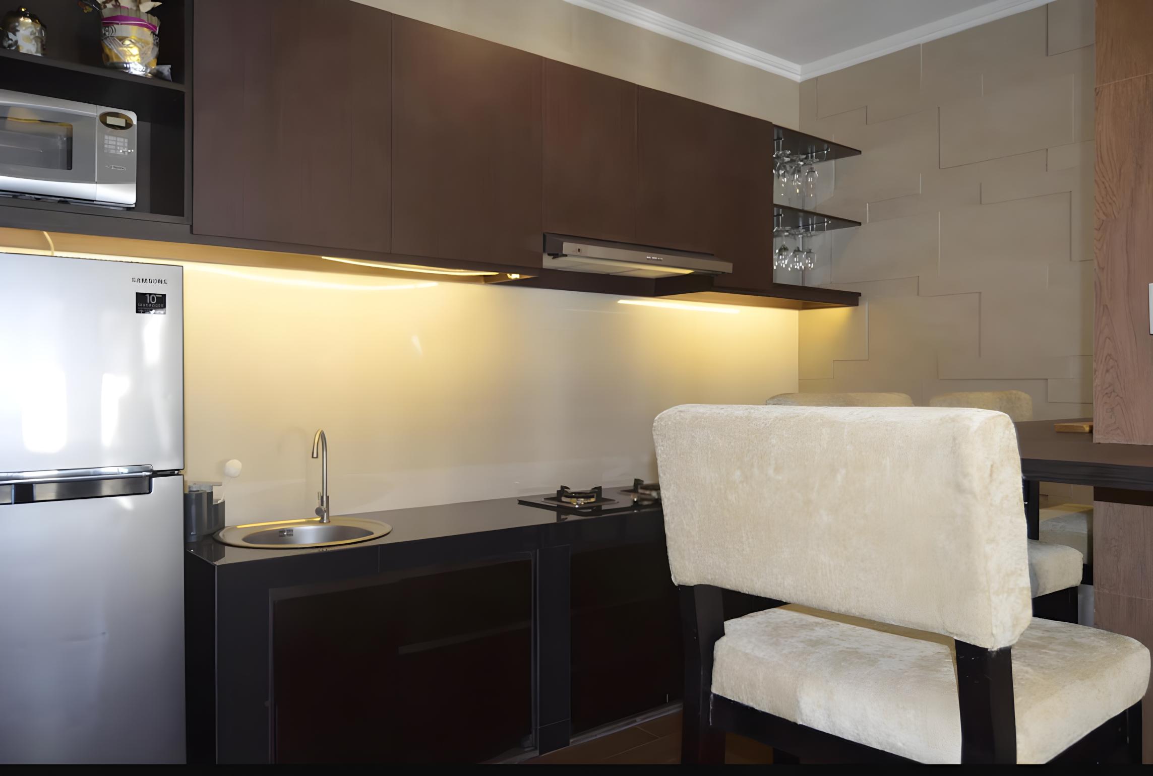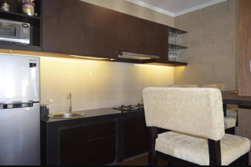 — Мини-кухня оборудована холодильником, плитой и микроволновой печью