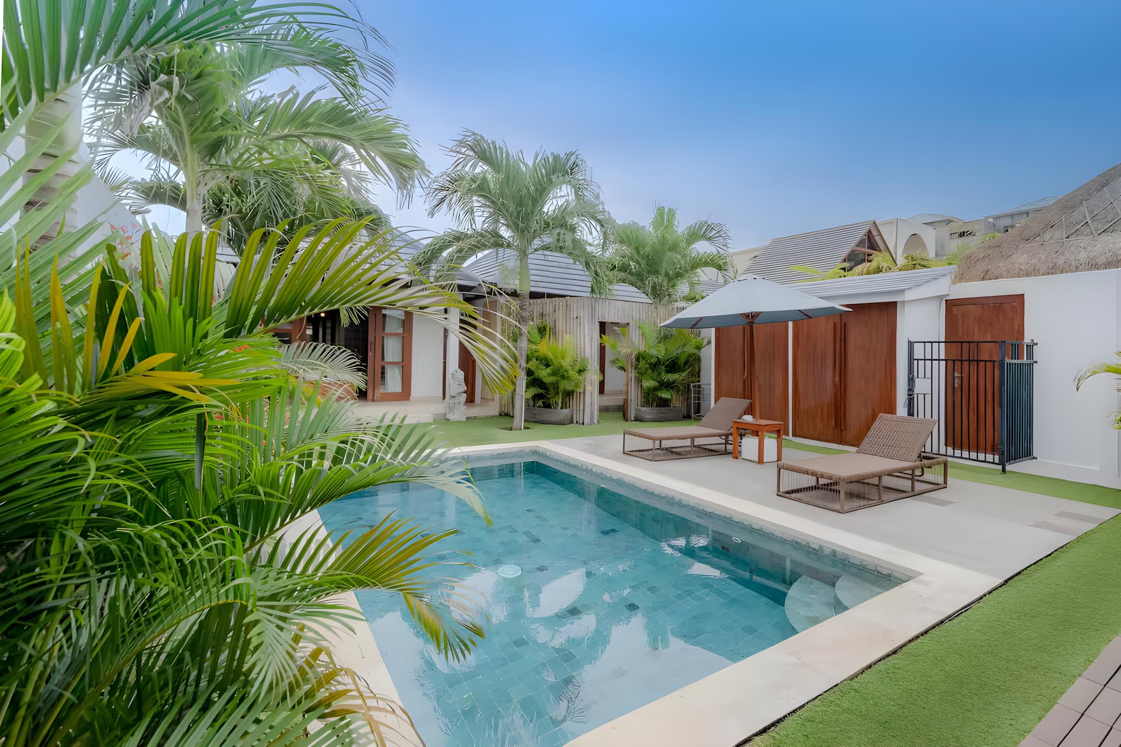Частный бассейн с удобными шезлонгами.
