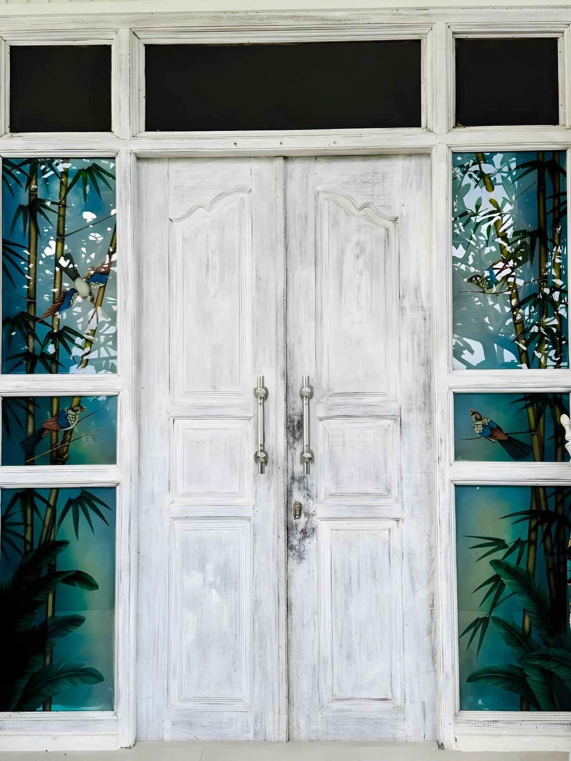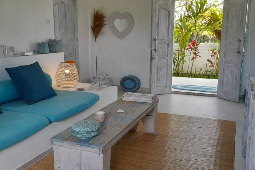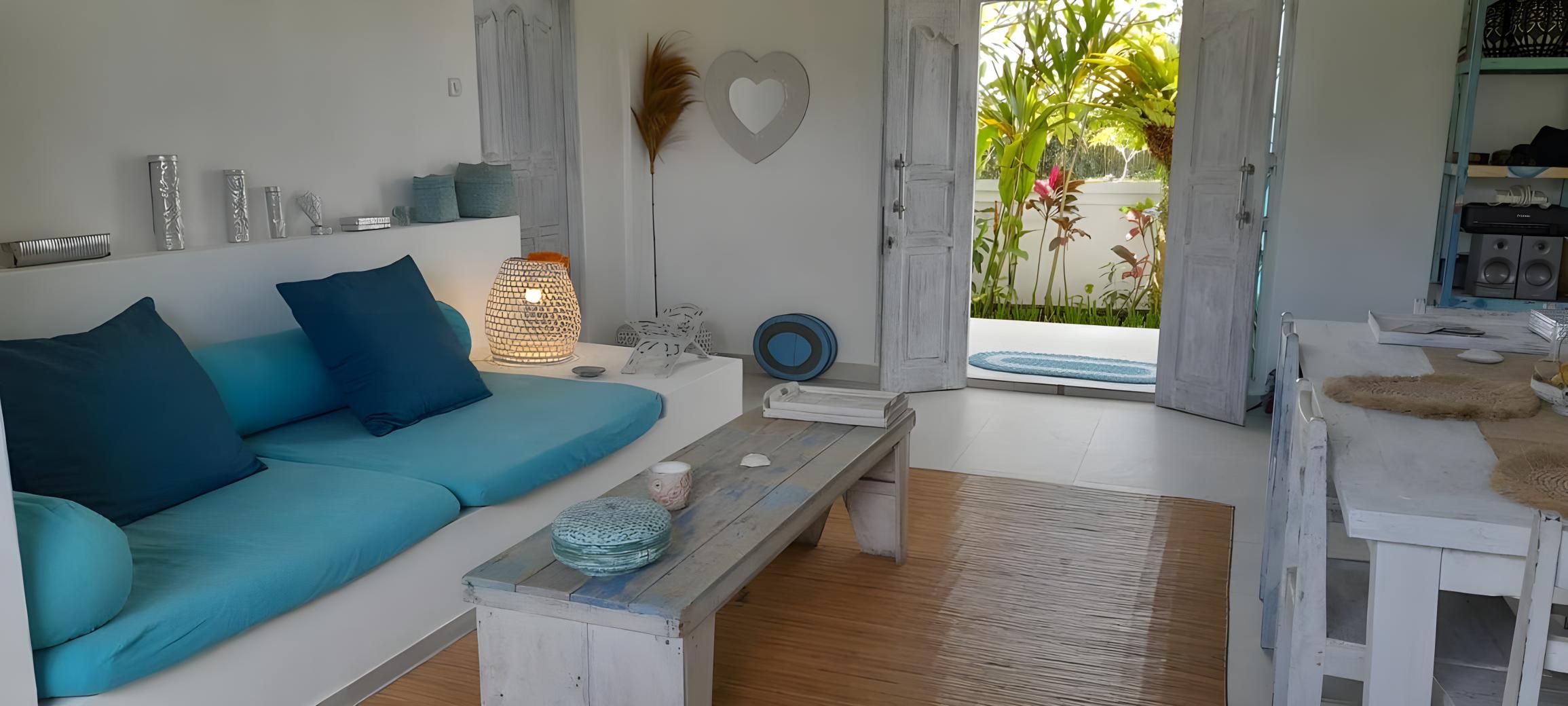 A beautiful, bright, light-filled soft sky-blue and white Mediterranean-inspired villa with clear and expansive ambiance.