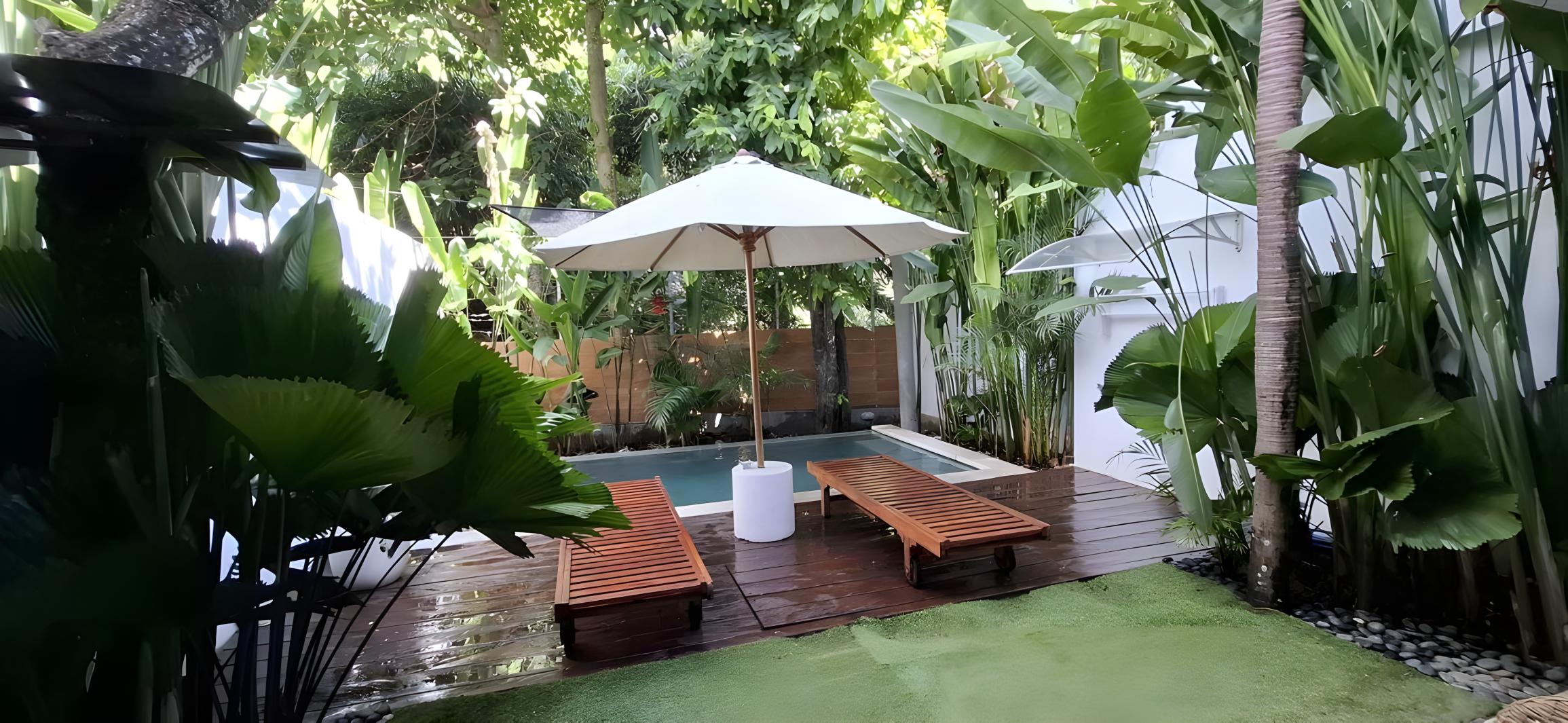 Частный бассейн, зелёная территория, лежаки, зонтик